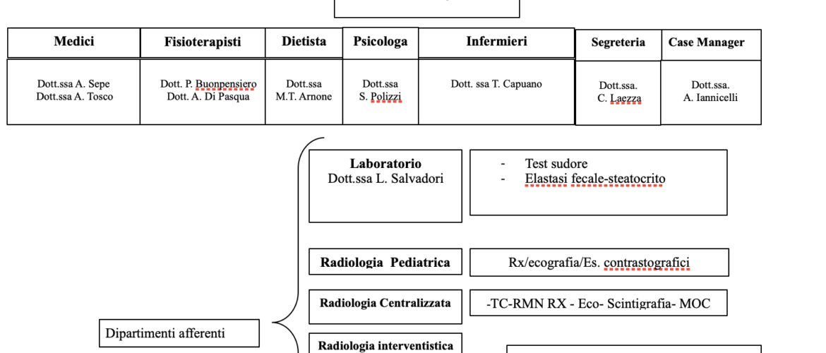 Nel Centro è presente un team specialistico multidisciplinare, multiprofessionale. Il team è composto da personale strutturato costituito da medici, fisioterapisti, dietisti, biologi, psicologi, assistenti sociali, infermieri, assistenti in formazione (vedi organigramma qui sotto). Il personale del team, in continuo aggiornamento, partecipa alla stesura di protocolli/raccomandazioni interne per il trattamento della FC e delle complicanze correlate. Gli assistenti in formazione svolgono regolarmente attività didattica attraverso l’organizzazione di seminari o la discussione di casi clinici su problematiche inerenti la FC.